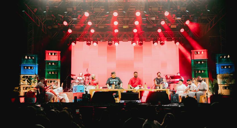 No palco, essa ideia ganha forma logo de cara. O Menos é Mais foge da tradicional “caixa preta” ao apostar em cenário claro, leve e cheio de identidade. Tons de bege dominam o espaço, enquanto diferentes níveis para os músicos ampliam a visibilidade e aproximam ainda mais o público. Nos conteúdos de LED, referências como “caquinhos” de botequim e azulejos inspirados na arquitetura popular — com conexão à obra de Athos Bulcão — reforçam essa estética brasileira. Para equilibrar, elementos orgânicos como plantas, cadeiras e caixas de cerveja coloridas, inspirados no “Churrasquinho Menos é Mais”, entram em cena e ajudam a contar a história do show.